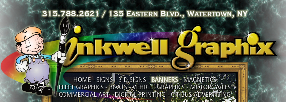 Inkwell Graphix is located at 135 Eastern Boulevard, Watertown, NY 13601. Our phone number 315-788-2621. We offer commercial art and design, signs and banners, vehicle and boat graphics and large format digital printing services. Open Mon-Fri from 9 am to 5 pm, and on weekends by appointment.