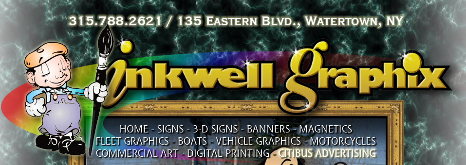 Inkwell Graphix is located at 135 Eastern Boulevard, Watertown, NY 13601. Our phone number 315-788-2621. We offer commercial art and design, signs and banners, vehicle and boat graphics and large format digital printing services. Open Mon-Fri from 9 am to 5 pm, and on weekends by appointment.