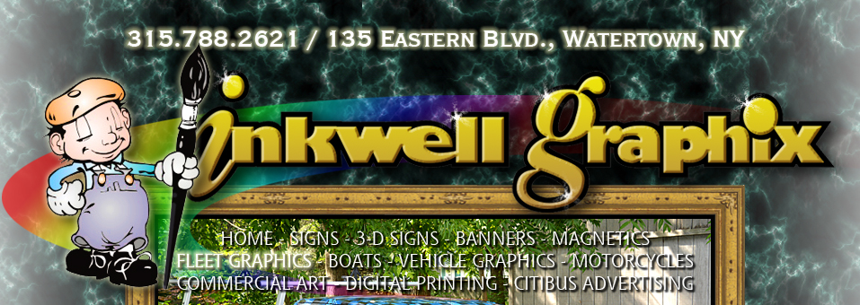 Inkwell Graphix is located at 135 Eastern Boulevard, Watertown, NY 13601. Our phone number 315-788-2621. We offer commercial art and design, signs and banners, vehicle and boat graphics and large format digital printing services. Open Mon-Fri from 9 am to 5 pm, and on weekends by appointment.